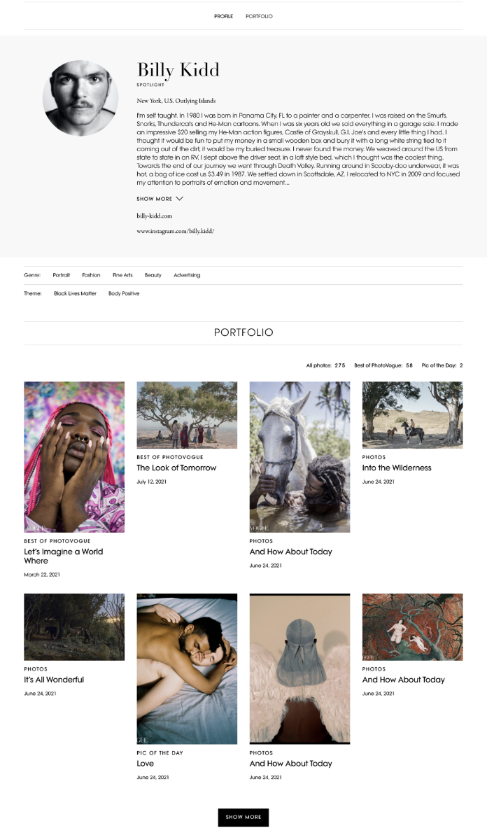 PhotoVogue is an international photography platform and community that showcases the work of emerging and underrepresented artists, while connecting them to other photographers, artists and creatives within the Condé Nast network.